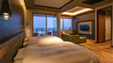 晴の棟の基本クラスのお部屋です。窓際にベッドがあり、ベッドからも青い海と空がご覧いただけます。もちろんお部屋には海の見える露天風呂付きで、スマートテレビも備え付けられております。